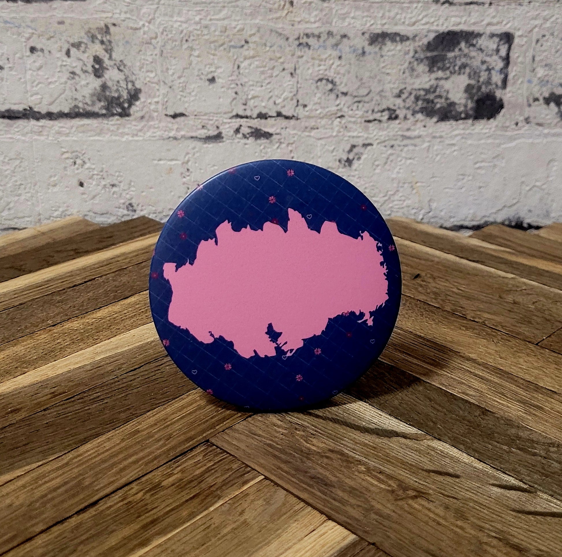 Dank seiner rückseitigen Aufstellerfunktion, kann der Button hingestellt werden. Der Überzug der Front ist aus spezieller matter Folie, die mit einem non permanent Stift beschreibbar ist. Auch kann man das Beschriebene mit einem wenig feuchten Tuch leicht wieder abwischen.