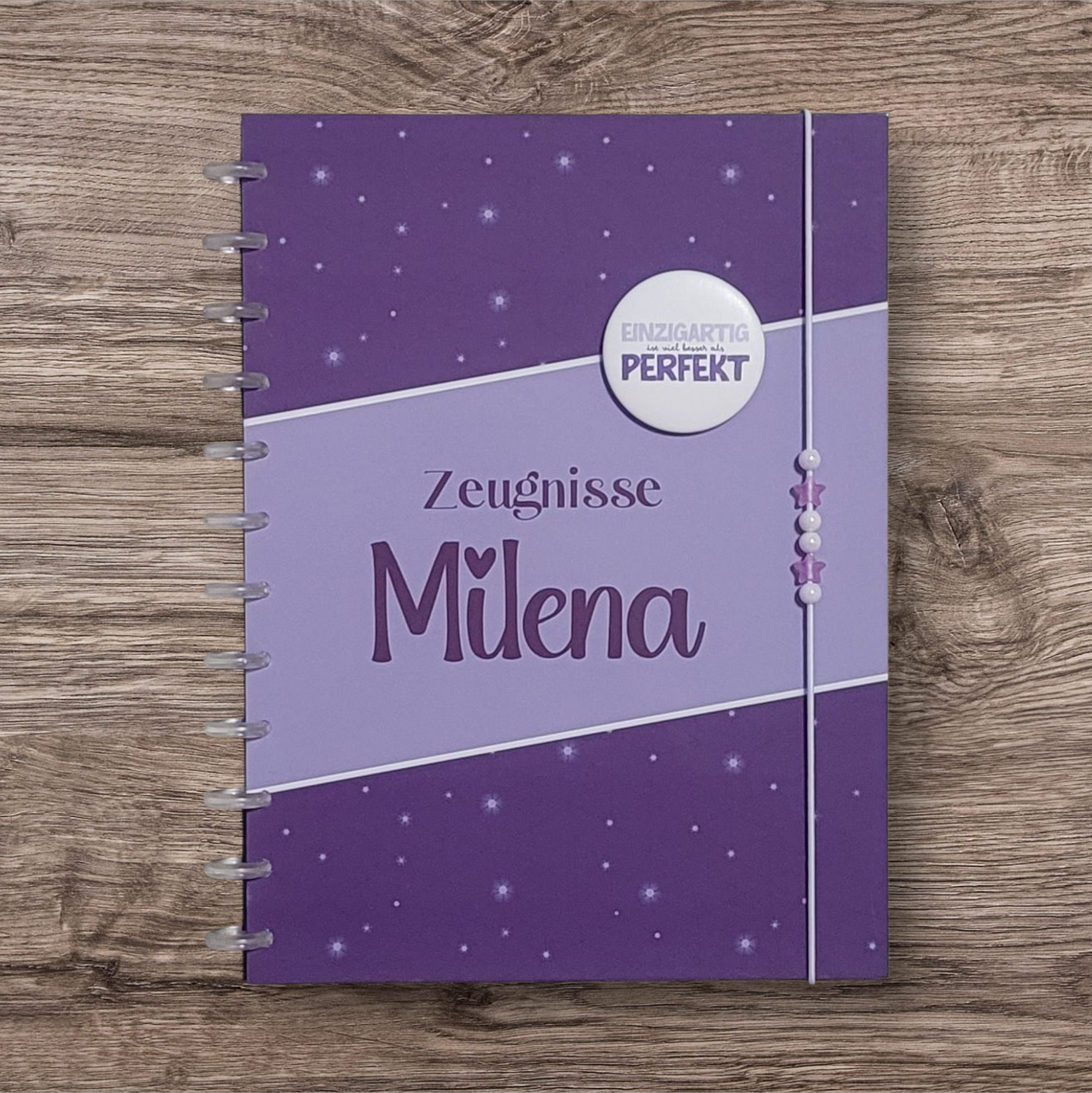 Die Schriftzüge "Zeugnisse" und der Name des Schulkindes werden im oberen Teil auf der Vorderseite des Designs platziert. Bitte teile mir nach Bestellabschluss den Namen mit. Achte hierbei unbedingt auf eine korrekte Schreibweise, denn mit diesem Namen wird die Zeugnismappe dann veredelt.