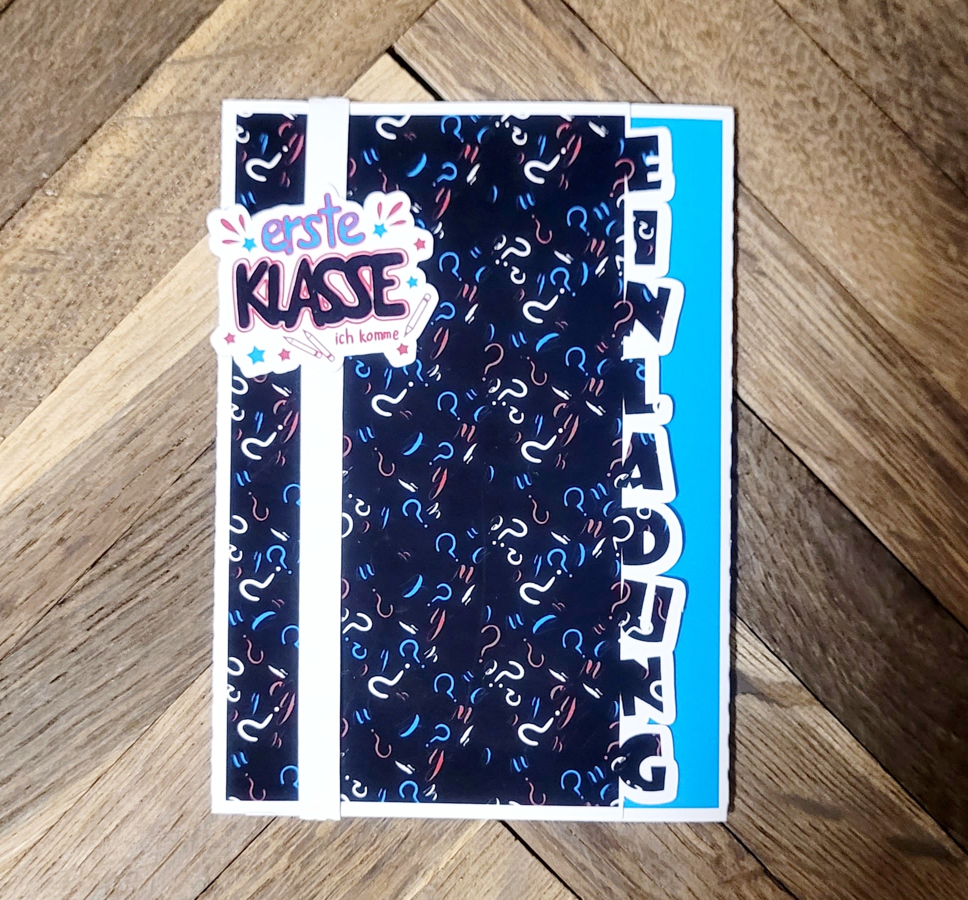 Diese stilvolle Einladungskarte zur Einschulungsfeier ist aufklappbar und hat u.a. genug Platz für eventuell wichtige Informationen zum Ablauf der Einschulung. Sie ist aus stabilem Cardstock liebevoll angefertigt und ganz im Design farblich passend abgestimmt zum Schulbeginn. Das Schiebeelement zum verschließen, mit Deko Stamp "erste Klasse ich komme" ziert die Karte perfekt.